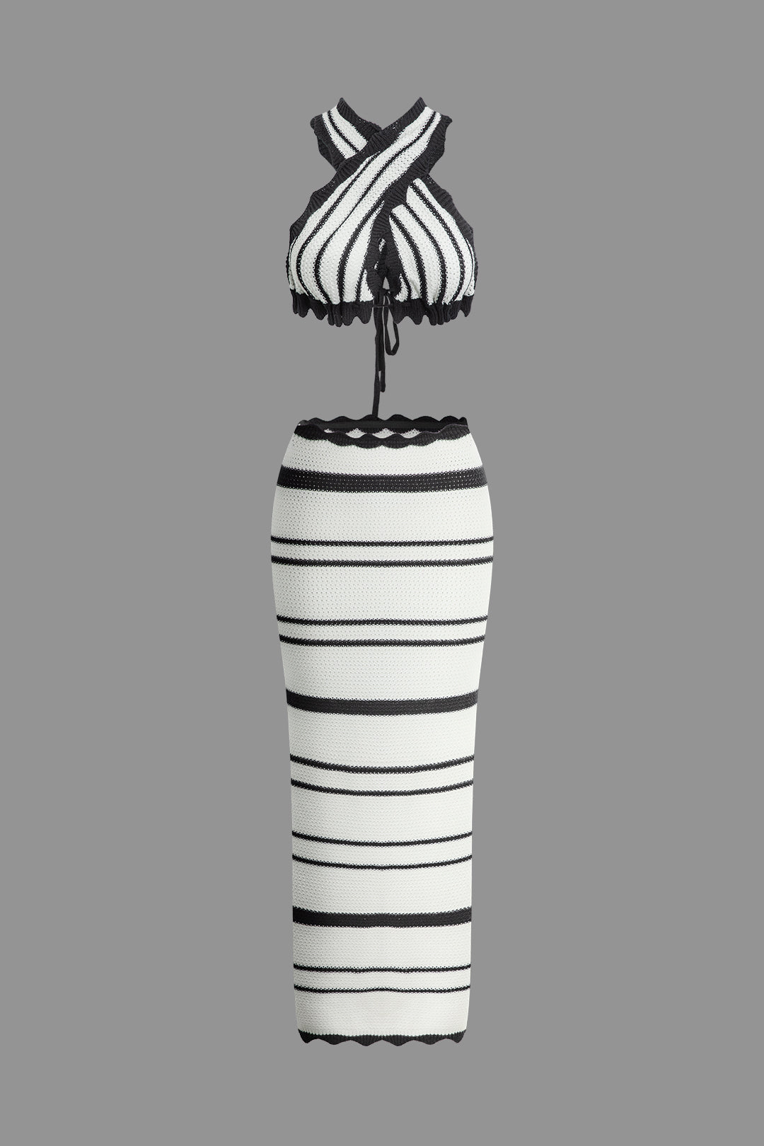 Das Shay Set besteht aus einem Fishtail-Maxirock und einem kontrastierenden Häkel-Bralette. Der Rock verfügt über einen elastischen Bund und eine figurbetonte Passform, die die natürliche Hüftlinie betont. Ein hoher, eng anliegender Bund geht in einen schönen Fishtail-Saum über, der am oberen Rand mit Muschelkanten verziert ist und von oben nach unten mit kräftigen Streifen in verschiedenen Breiten durchzogen ist.